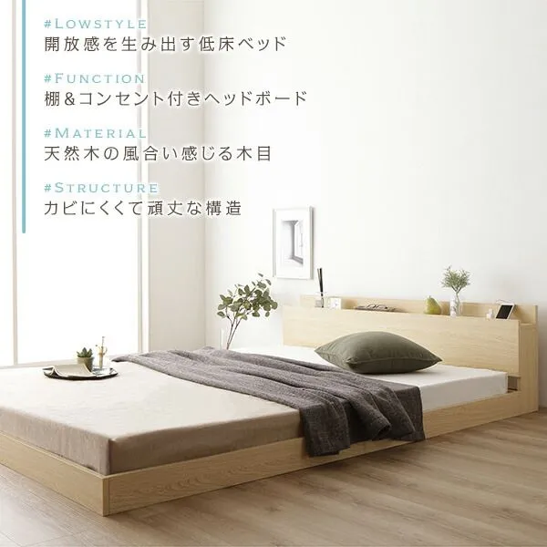 ベッド シングル ボンネルコイルマットレス付き ナチュラル 低床 すのこ 宮付 棚付 宮棚付 ヘッドボード コンセント付 通気性 頑丈 ロータイプ ベット すのこベッド ローベッド フロアベッド ベッドフレーム シングルベッド ベッドルーム
