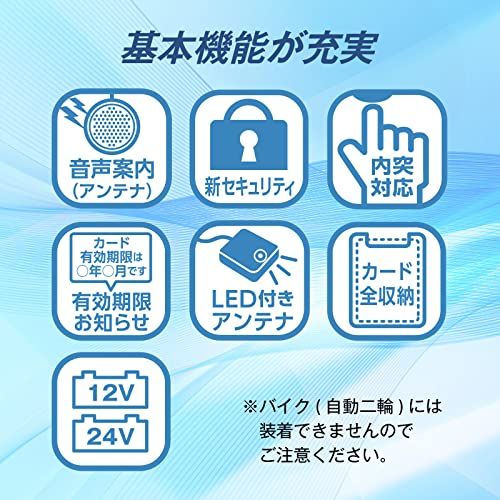 電源電圧:DC12V/24V 消費電流:80mA/50mA 本体寸法:W70mm H19mm D106mm アンテナ寸法:W32.6mm H13.4mm D38.6mm アンテナ取付:フロントガラス(水平面を基準に2060)