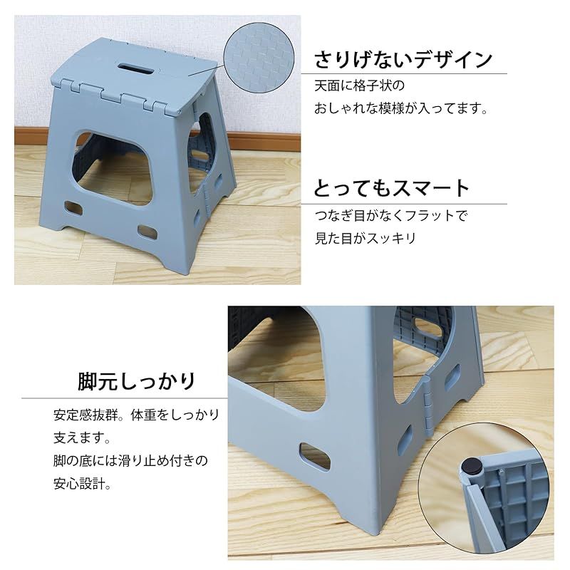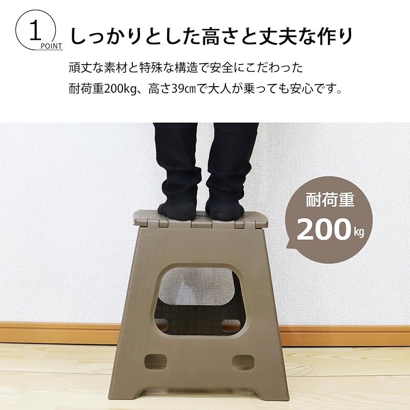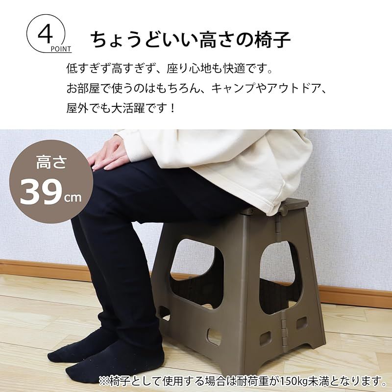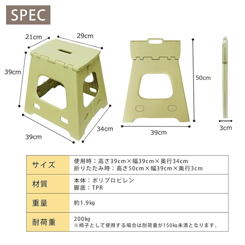 【商品概要】 サイズ:[使用時]高さ39cm×幅39cm×奥行34cm [折り畳み時]高さ50cm×幅39cm×奥行3cm 耐荷重:200(※椅子として使用する場合は耐荷重150kg未満。) ※耐荷重について、本体天面に均一に荷重をかけた時の数値です。 一部だけに荷重がかかる使い方・100以上の方が立ったりする場合は破損の恐れがありますので、天面に均一に荷重がかかるように施すことを推奨します。 材質:[本体]ポリプロピレン [脚底]TPR 重量:約1.9kg