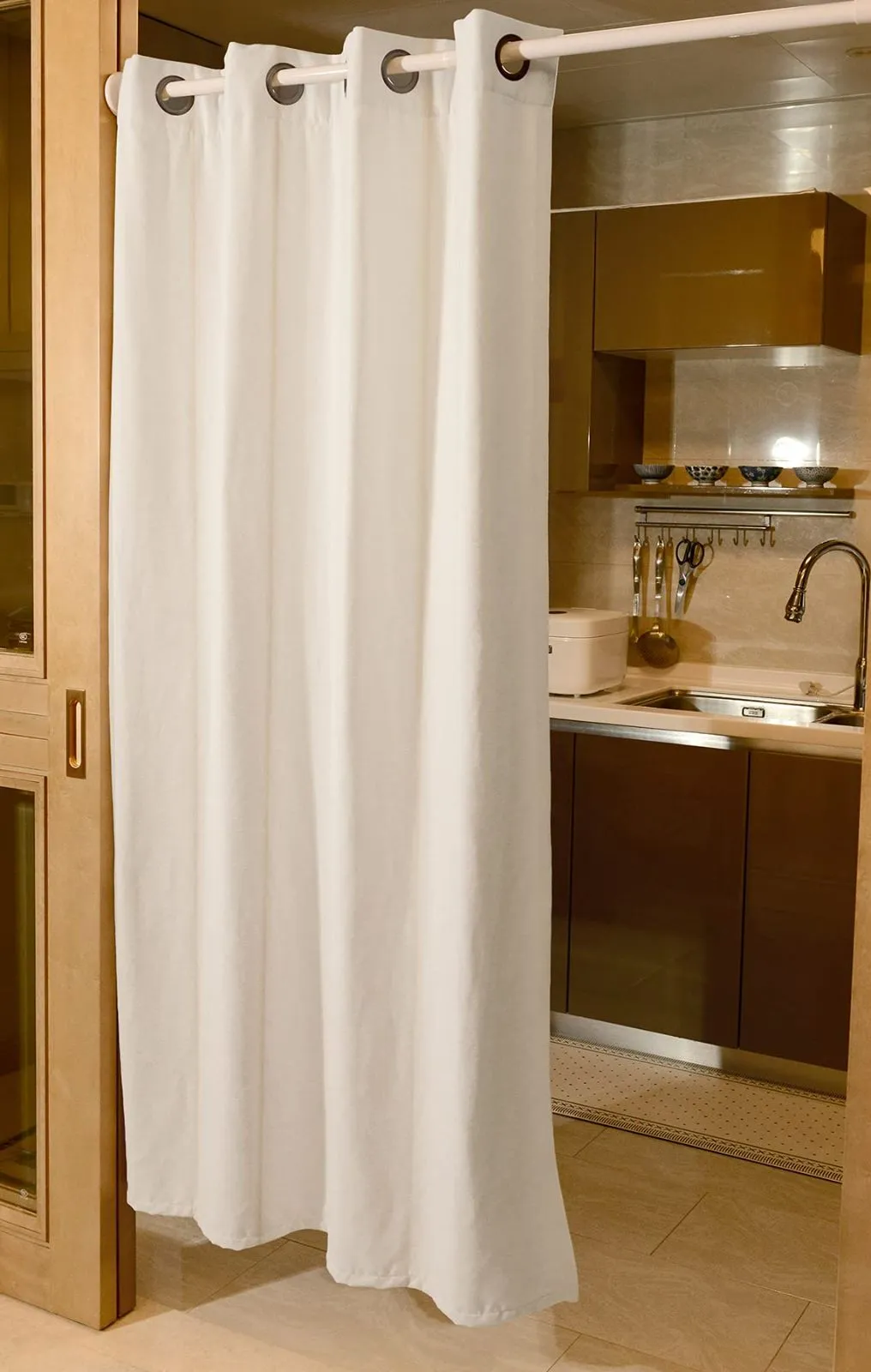 【サイズ】幅120CMx丈180CM一枚入り、重さ650gくらい、「幅60ー90cm範囲の設置場所に雰囲気がいい、最大適用幅は100cmまで」ハトメ8個つき内径4CM、つっぱり棒に簡単に取り付ける間仕切りカーテン(ご注意:つっぱり棒は付属しておりません)