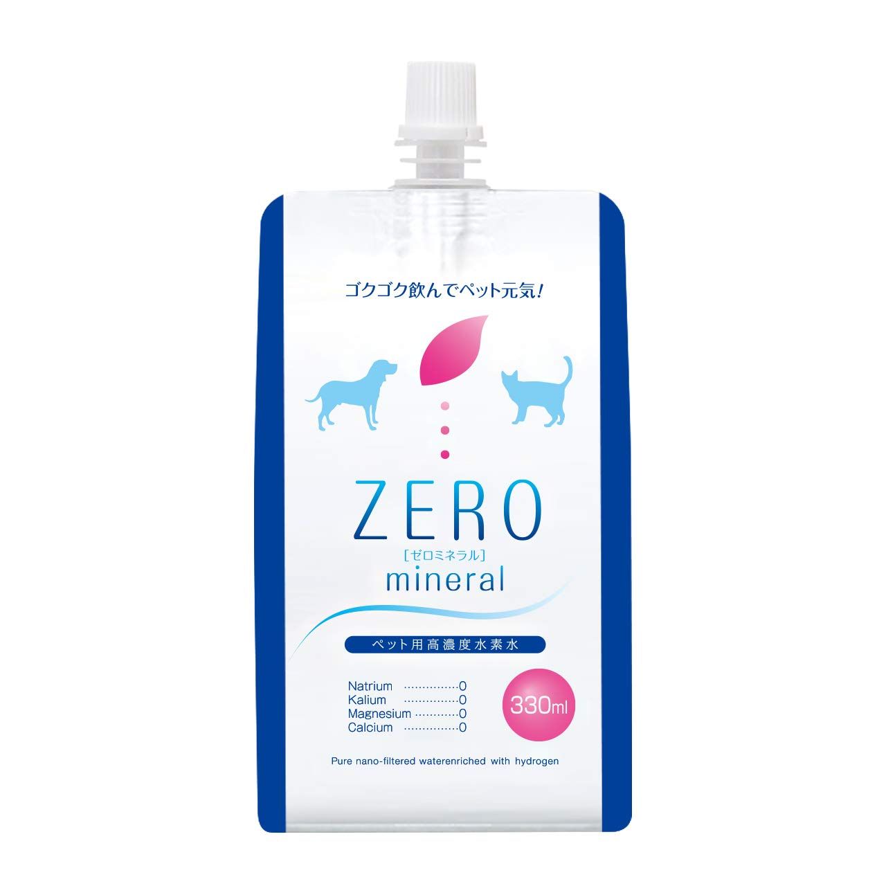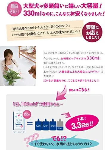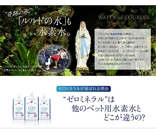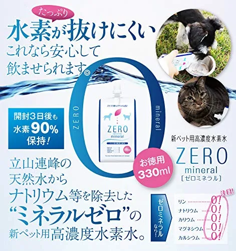 【ZEROミネラルとは?】ゼロミネラルは「名水百選」に4件も選定された富山県、立山連峰の冷たい雪解け水が原水。長い年月をかけて森林や岩石の天然ろ過フィルターにより磨かれた清らかな天然水に、独自の製造技術で水素をたっぷり溶け込ませたペット用水素水です。その用途は飲料水はもちろん、加温してふやかしフードにも。容器は小分けパウチで旅行やお散歩、災害用の保存水にも便利です。