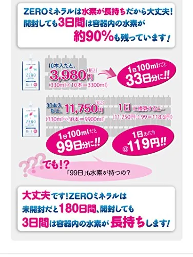 【賞味期限後は保存水として】ZEROミネラルの賞味期限(水素保持期限)は製造日から180日です。ペット用水素水として販売しているため、賞味期限容器内に水素が残存している期限を表示しています。賞味期限を過ぎると容器内の水素は消失しますが、飲めなくなるわけではございません。容器に印字された賞味期限から1年間はペット用飲料水や保存水としてご活用いただけます。
