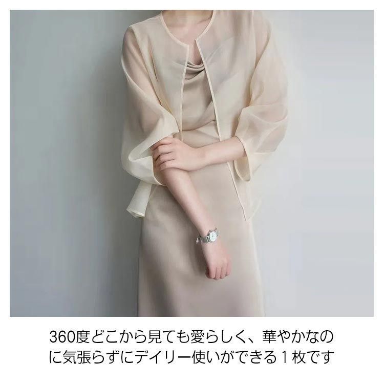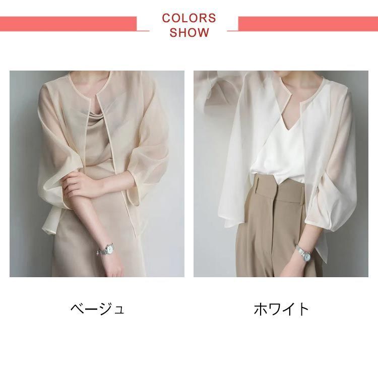 ■こちらの商品は沖縄・離島は配送料が異なります。 ご購入前にお知らせください。 お住まいの地域に合わせた専用ページを作成いたします。 サイズ:S M L XL 2XL サイズについての説明: S:着丈51.5/肩幅37/バスト99/袖丈55cm M:着丈52.5/肩幅38/バスト103/袖丈56cm L:着丈53.5/肩幅39/バスト107/袖丈57cm XL:着丈54.5/肩幅40/バスト111/袖丈58cm 2XL:着丈55.5/肩幅41/バスト115/袖丈59cm 素材:ポリエステル 色:ベージュ ホワイト 上品な印象を引き出す、合わせやすいカラー展開でご用意しました。 360度どこから見ても愛らしく、華やかなのに気張らずにデイリー使いができる1枚です。 オフィス使いにも適したシンプルさでON、OFF問わずお召いただける優秀アイテムです。 夏は冷房対策、UV対策として用意しておくのもおススメです。合わせやすいカラーと春らしいカラーでご用意しました。 プラス配送料の目安 沖縄・離島 +2,000円