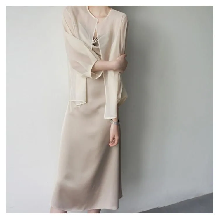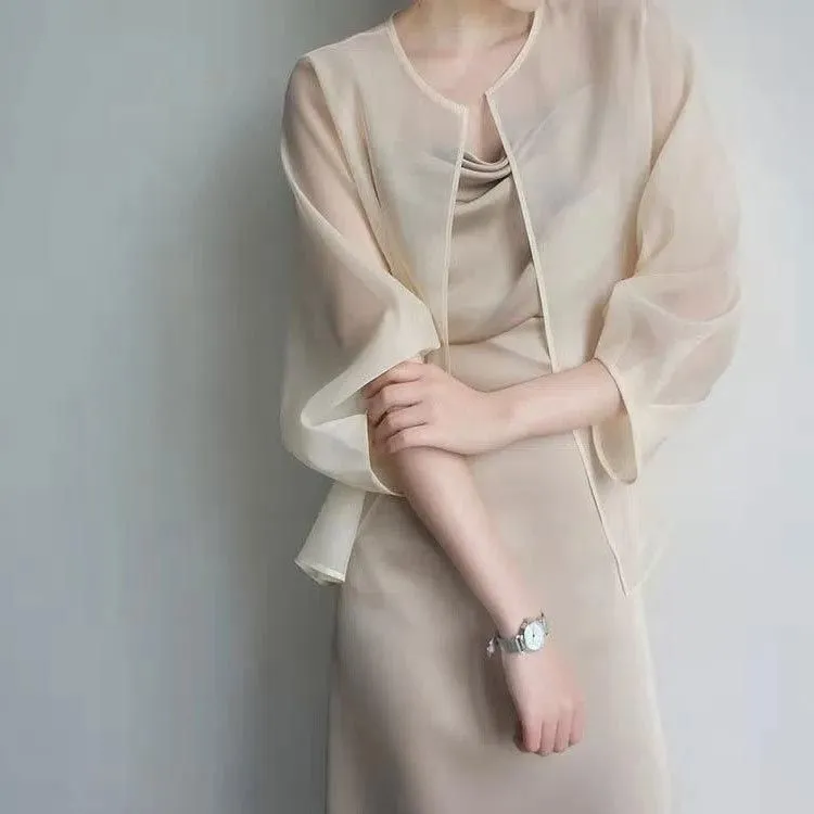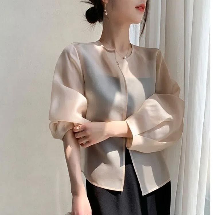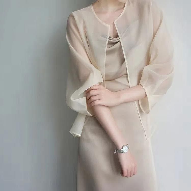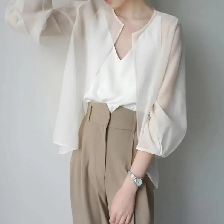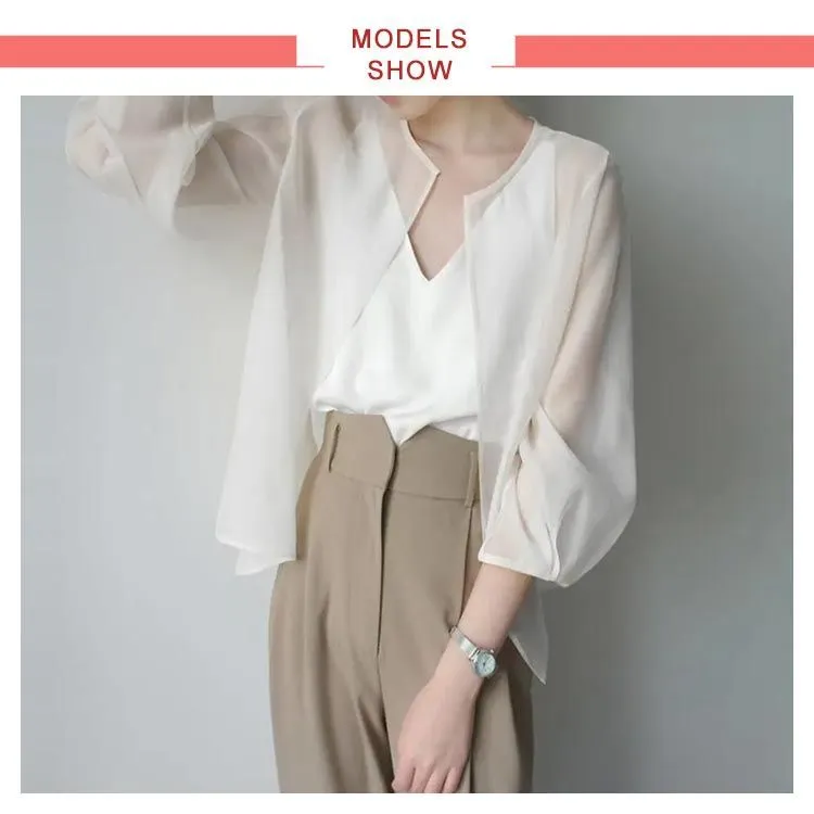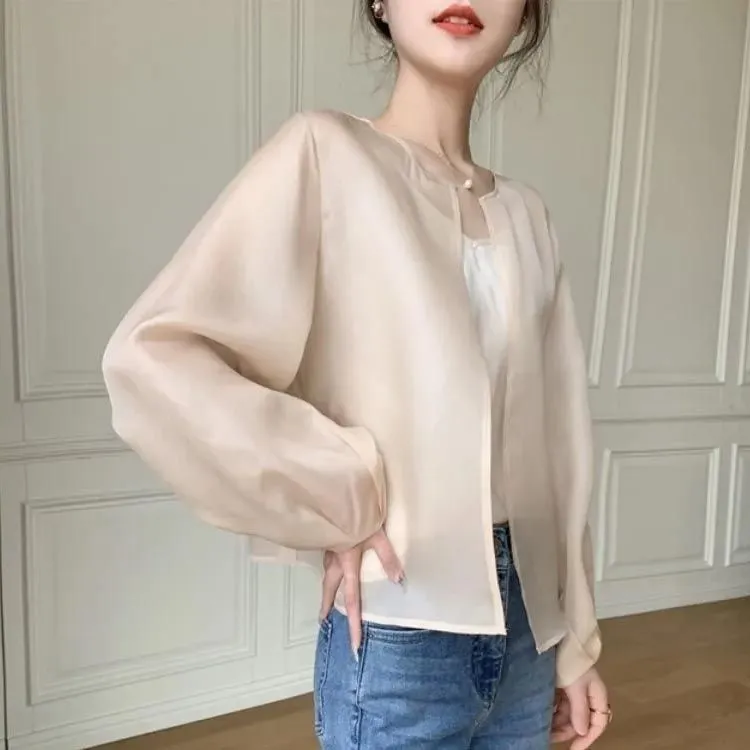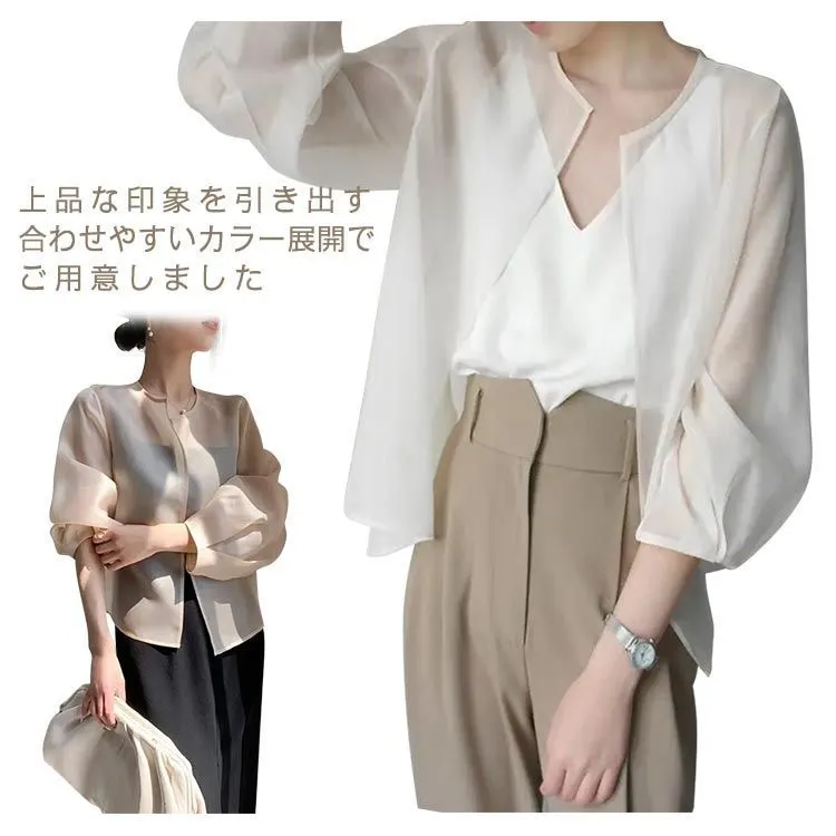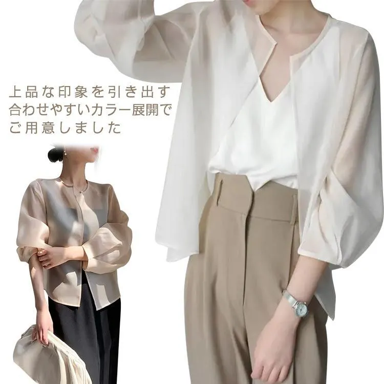 シアートップス レディース シースルー 透け感 長袖 薄手 シフォン オーガンジー 紫外線対策 UVカット 冷房対策 羽織 ライトアウター ノーカラー シアーカーディガン