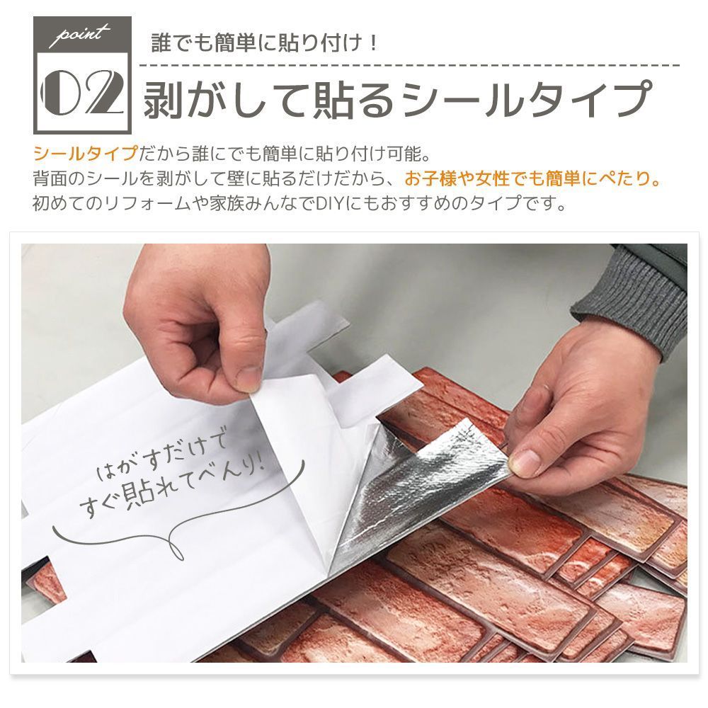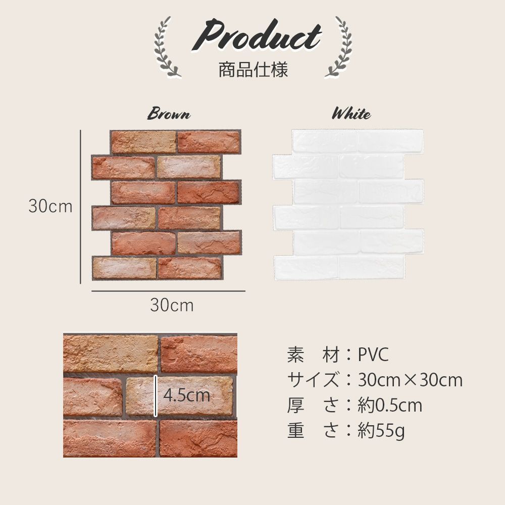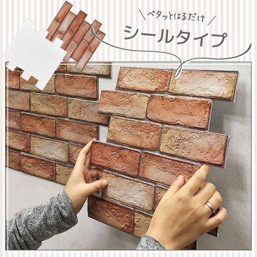 ■こちらの商品は沖縄・離島は配送料が異なります。 ご購入前にお知らせください。 お住まいの地域に合わせた専用ページを作成いたします。 お部屋をお手軽DIY! キズ・汚れ隠しや、壁のイメージチェンジに最適です。 特徴 - 立体的な質感:3D構造で立体感があり、レンガの質感を再現 - シールタイプ:剥がして貼るだけの簡単施工 - ハサミ・カッターでOK:サイズ調整も楽ちん - アレンジ不要:左右タイルカット済みで自然に繋げられる 商品詳細 - カラー:ブラウン/ホワイト - サイズ:30cm×30cm - 枚数:10枚セット ご注意 - 再貼付けはできません - 取り外しの際の壁の損傷については責任を負いかねます - 輸入製品のため、若干のキズ・汚れがある場合がございます - ご利用の環境によって色の見え方が異なる場合がございます プラス配送料の目安 沖縄・離島 +2,000円
