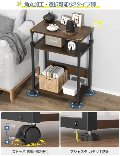 天板の昇降機能:パソコンワゴンの天板は高さが調節可能です。高さ調節するときは4箇所のハンドルを手回します。場所によってベストな高さ(67cm95cm間、キャスターを使用)を調整できます。高さ調節のつまみは、組み立ての際に四側にすることはできます。デスクの下に入れると邪魔しません。高さが調節できるサイドデスクとしては使用し、机が拡張され作業効率がUPしました。