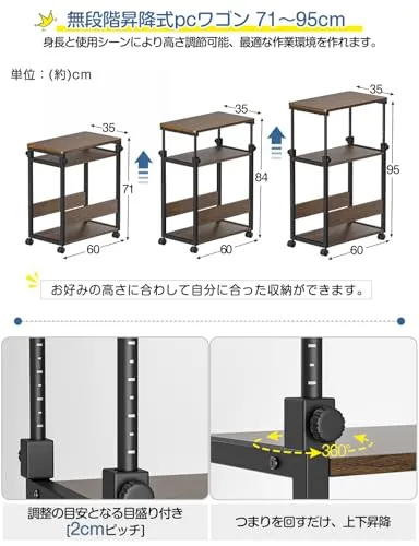 D★DAIWIN pcラック 昇降式 幅35×奥行60×高さ67?95cm パソコンワゴン キャスター付き cpuワゴン 天板高さ調節可能 pc 棚 デスクワゴン パソコン収納 木製 デスクサイドワゴン パソコン 棚 複合機ラック オフィス収納 オフィスワゴン