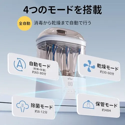 【4つのモードを搭載】: 除菌乾燥モード、除菌モード、乾燥モード、保管モード、4 つのモードを搭載します。多様なニーズに応え、時間と労力を大幅に節約します。空焚き防止機能つきで、水が無くなると自動的に電源オフします。