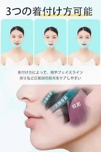 【3つの着付け方】口か鼻出せるように真ん中丸い穴が二つあり、3つの着付け方可能ので、頬やフェイスライン周りなど広範囲の筋肉をケアしやすい。
