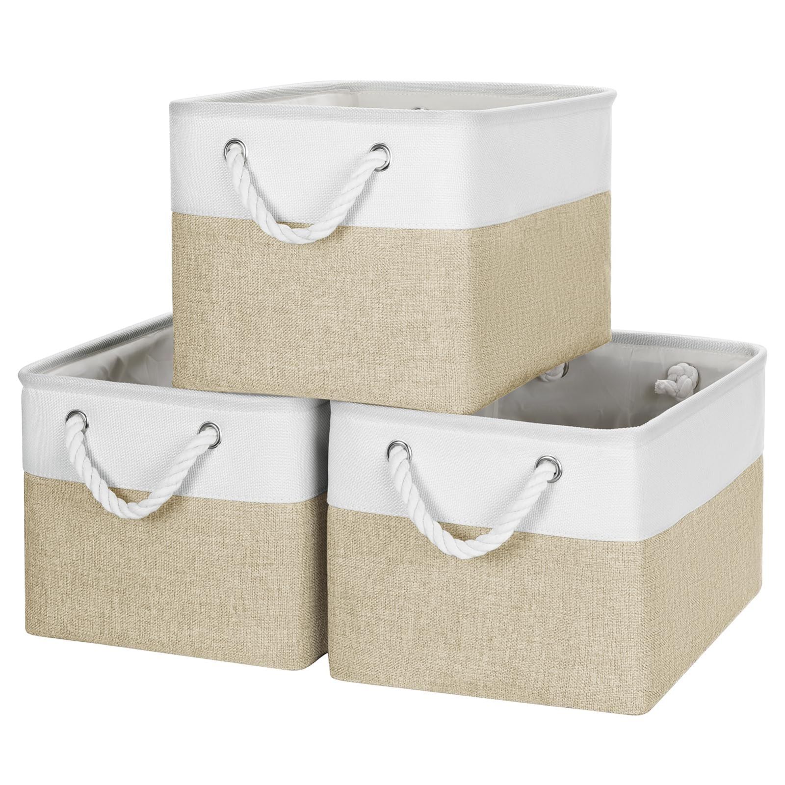 Oterri 収納バスケット 収納カゴ 3個セット 折りたたみ式 幅38×奥行28×高さ24cm 大容量 収納ボックス 服/CD/おもちゃ/マンガ/書類 ランドリーバスケット 取っ手付き 丈夫な麻綿素材 (ホワイトベージュ)