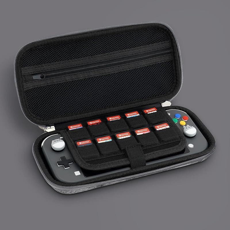 【商品概要】 Nintendo Switch Lite向けに設計されて、ゲームライフを向上させるために作られています。 プレミアム防水PU素材で作られた、丈夫なハードケースと柔らかい裏地の内部を組み合わせることで、皆様のデバイスの保護を強化し、偶発的な衝突、傷からコンソールを完全に保護します。 Switch Liteに対応用キャリングケースバッグに10枚のゲームカード受け口が含まれ、お気に入るゲームをらくに持ち運びます。ジッパー付きのメッシュポケットは、ケーブルやイヤホンなどの小物を収納することができます。中央の内部固定ストラップは、コンソールを所定の位置に保ち、持ち運び中に移動することを防ぎます。 取り外し可能なリスト・ストラップ付きの持ち運びやすい設計は、軽量および運び易く、多くの容積を加えないでバックパックに収容できます、旅行愛好家向けの完璧な保護コンパニオン。 手に入るもの:Nintendo Switch Liteに対応用キャリングケース1個、サムグリップキャップ1組、着脱可能なリストストラップ1個。Switchと有機el本体やその他の付属品は含まれないのでご注意ください。