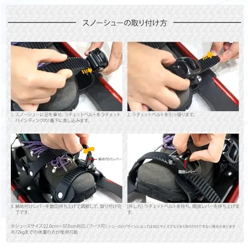 装着方法は、一般的なスノーボードに使われているラチェットバインディングを採用。簡単に取り付け・調整ができます。