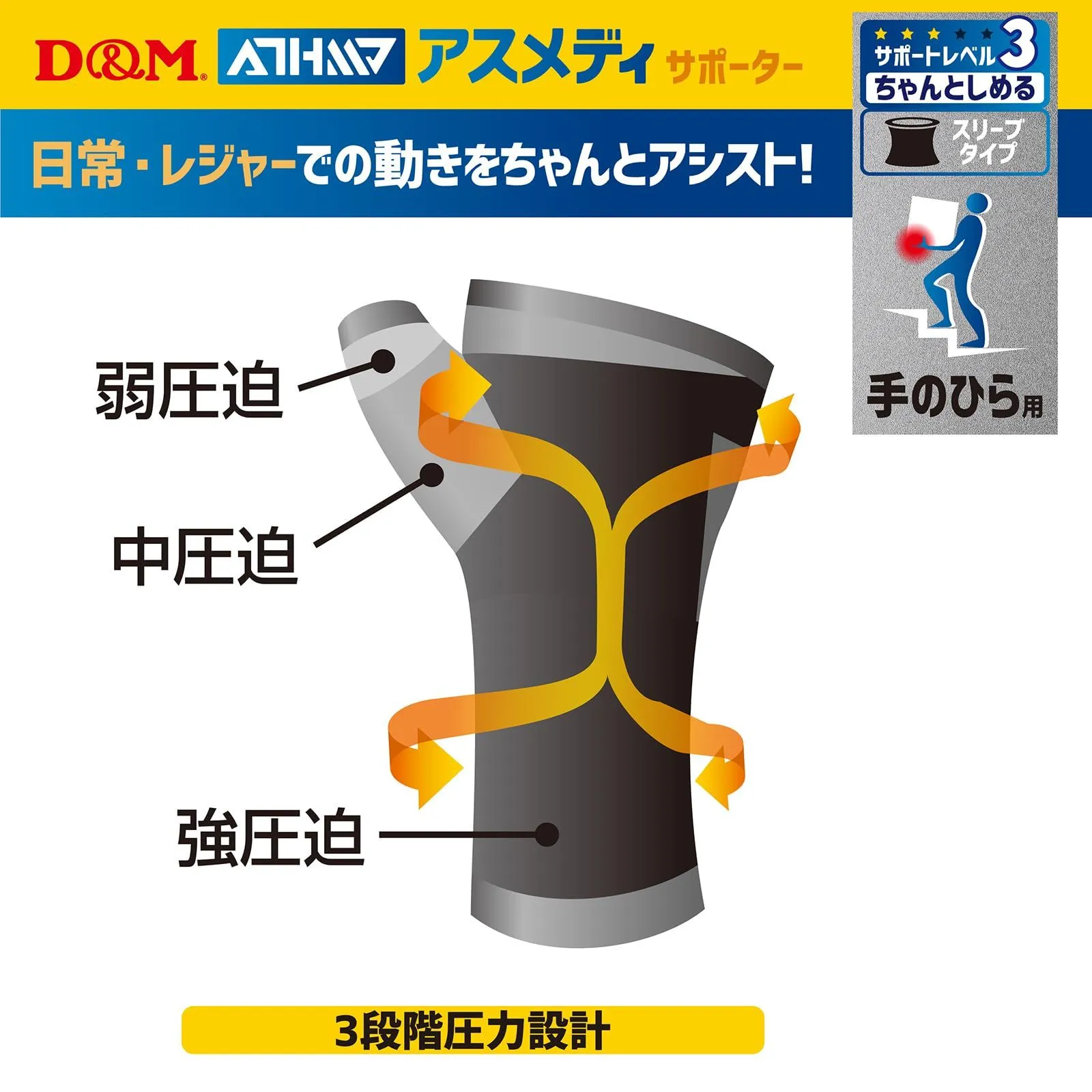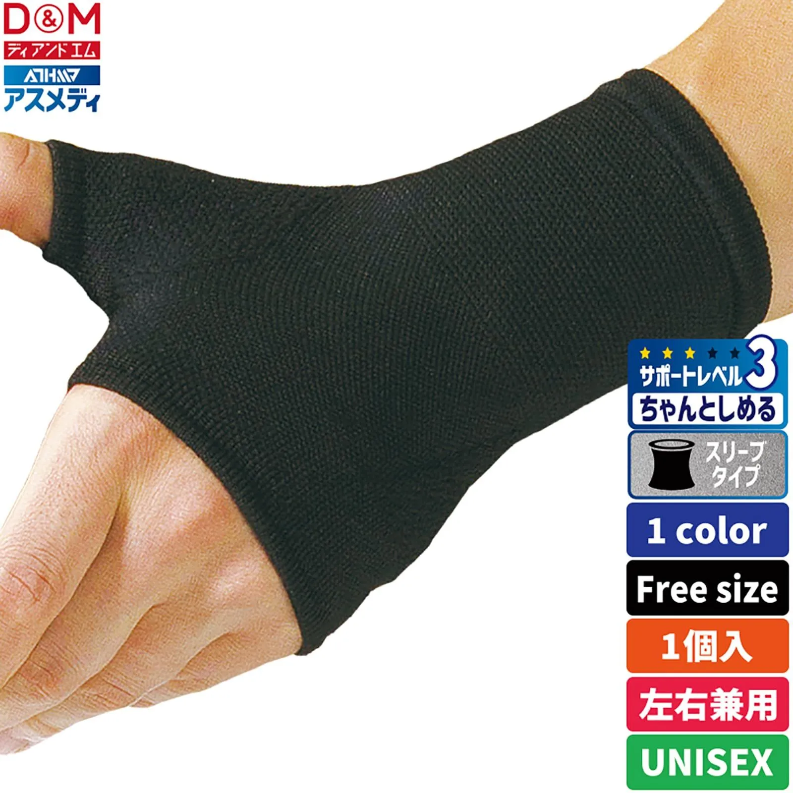 D&M ディーアンドエム アスメディ 手のひらサポーター 手のひら用 1個入 左右兼用 日本製 黒 フリーサイズ 108328 レベル3 スリーブタイプ 固定 サポート 伸縮 圧迫 スポーツ