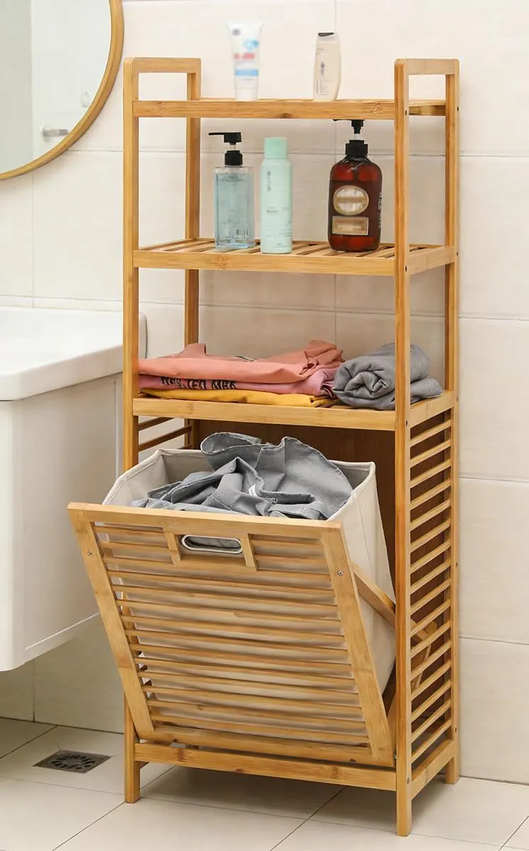 【在庫処分】ランドリー収納 タオルラック ラック 洗濯カゴ 脱衣所 通気性 幅50×奥行30×高さ119cm 大容量 ランドリーバスケット付き 省スペース 侘び寂び 寝室・脱衣所・ランドリールーム用 竹製 組立簡単 3段 日本語説明書付き(ナチュラル) ランド