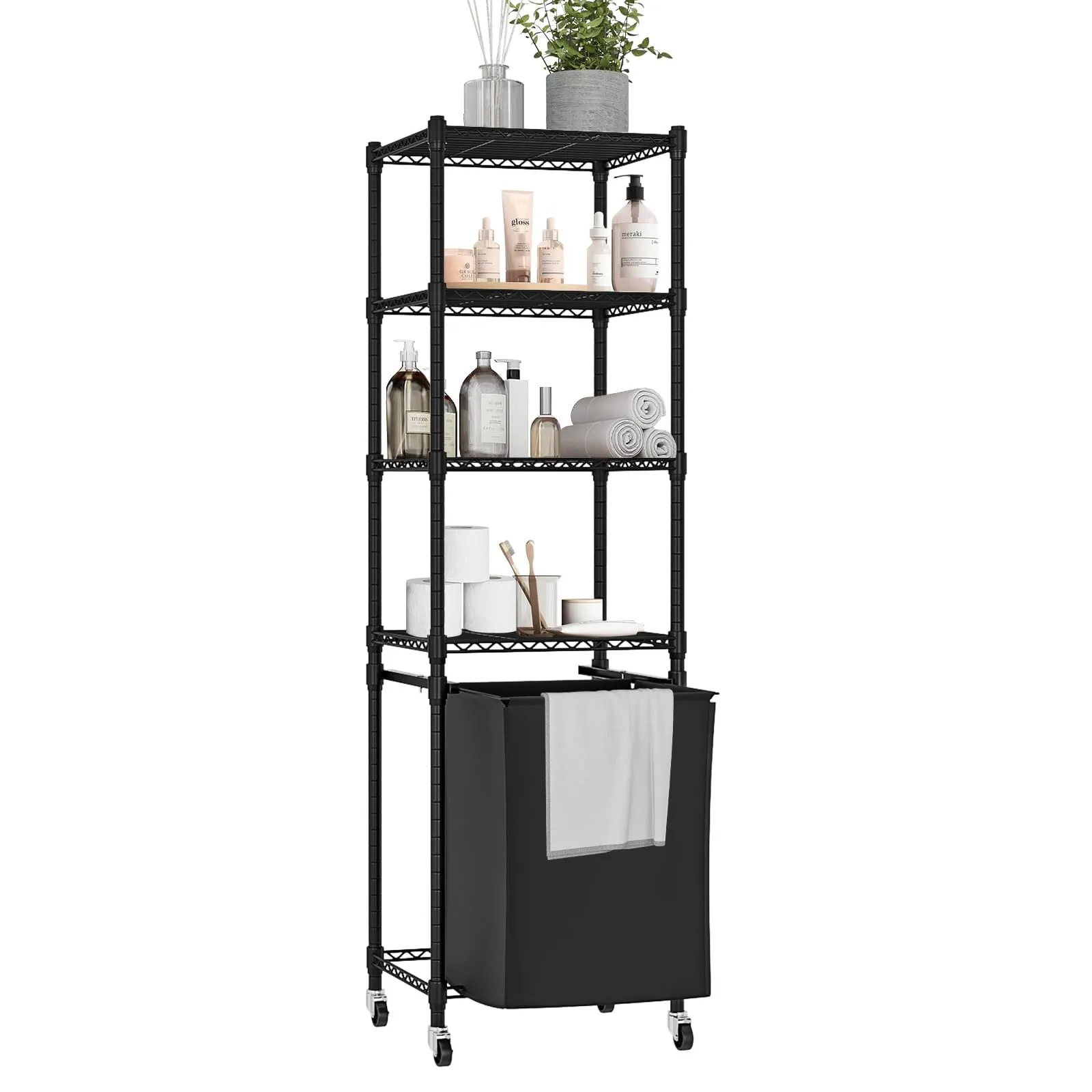 【在庫処分】5段 バスケット付き 洗濯機ラック 2種類の組み立て 収納ラック ブラック 洗濯かご W40xD30xH129cm ランドリーラック