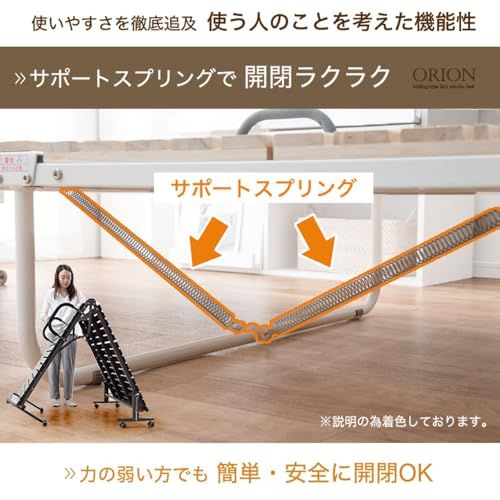 【サイズ】ベッド外寸:幅98奥行208高さ45cm / ベッド内寸:幅91奥行201cm / 折り畳み時外寸:幅98奥行45高さ110cm / すのこ板1枚:幅5長さ91厚み1.2cm(すのこ間隔:1.5cm) / 床から床板まで30cm 床板下から床まで25cm