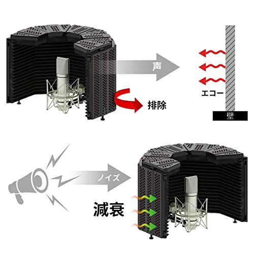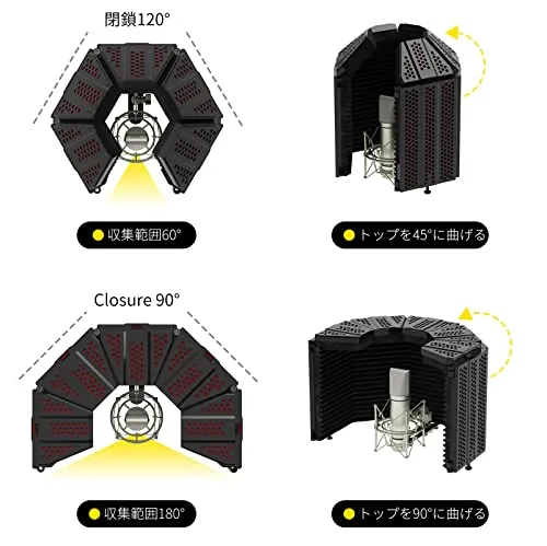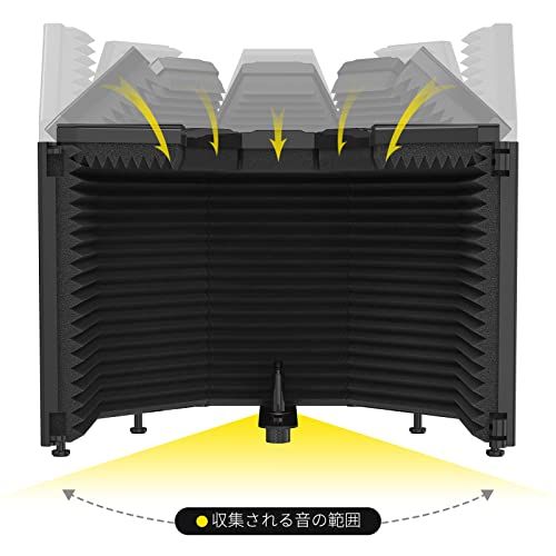 [柔軟性と利便性] マイク 防音シールドは2枚折り畳み式エンドパネルの3パネルデザイン、または4枚折り畳み式の5パネルデザインからお選びいただけます。アーチ型デザインは角度調節が容易で、遮音効果とマイクポジションの最適化を両立。スタジオ環境に応じた柔軟な設定により、常に最高品質の録音を維持することが可能でございます!