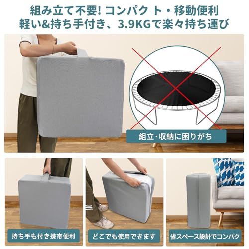 組み立て不要・収納便利:トランポリンは完成品の状態で届くので、組み立ては不要です。到着後すぐに使用できます!室内用トランポリンは四角いクッションの形状をしているため、スペースを気にする必要はありません。また、軽量で簡単に移動できるので、いつでもどこでも使用することができます。