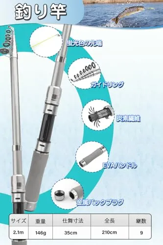 釣りセット 釣り竿セット 2.1m 投げ竿 カーボンロード スピニングリール プライヤー グリップ ルアー 釣り糸 収納袋付き 海釣 川釣 淡水釣 携帯便利 軽量 初心者向けt
