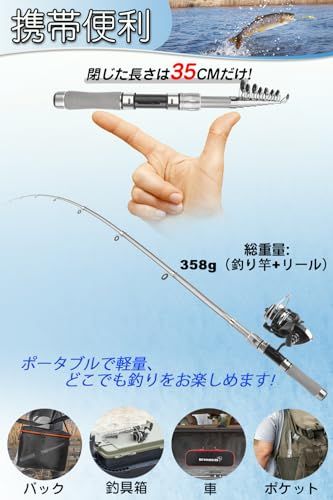 【コンパクトで携帯便利】-ロッドの仕舞寸法が40cm以上なのに対し、当社製品は僅か35cm頃です。重量も全体で358g(釣り竿リール)で、持ち運びや収納が大変便利です。さなお子様や女性でも投げ込みやすく、負担なく釣れます。車やバッグに常備できます。旅行・出張に、ツーリングに、レジャー先に気軽に持って出かけられます。