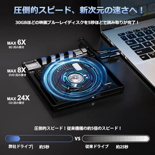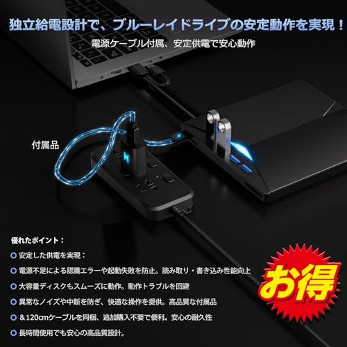 ブルーレイドライブ外付け!さらに速く軽く薄く安定性!】外付けブルーレイドライブ USB-A/C対応 BD DVD/CD 再生・読み込み・書き込み対応 ポータブルBlu-rayプレーヤー Windows 7-11/Mac OSパソコン対応 電源ケーブル付属t