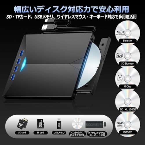 Blu-ray/DVD/CDに対応し、映画鑑賞・音楽再生・ゲームソフトのインストール・データバックアップなど、これ1台で多彩な用途に対応。 さらに、SD/TFカード、USBメモリ、ワイヤレスマウスやキーボードの接続にも対応。 Windows 7~11/Mac OSに対応し、初心者でも安心の日本語取扱説明書付き。おすすめの再生ソフトも記載されており、購入後すぐにBD/DVDを楽しめます。 再生・書き込みソフトは付属していません。別途ご用意ください。