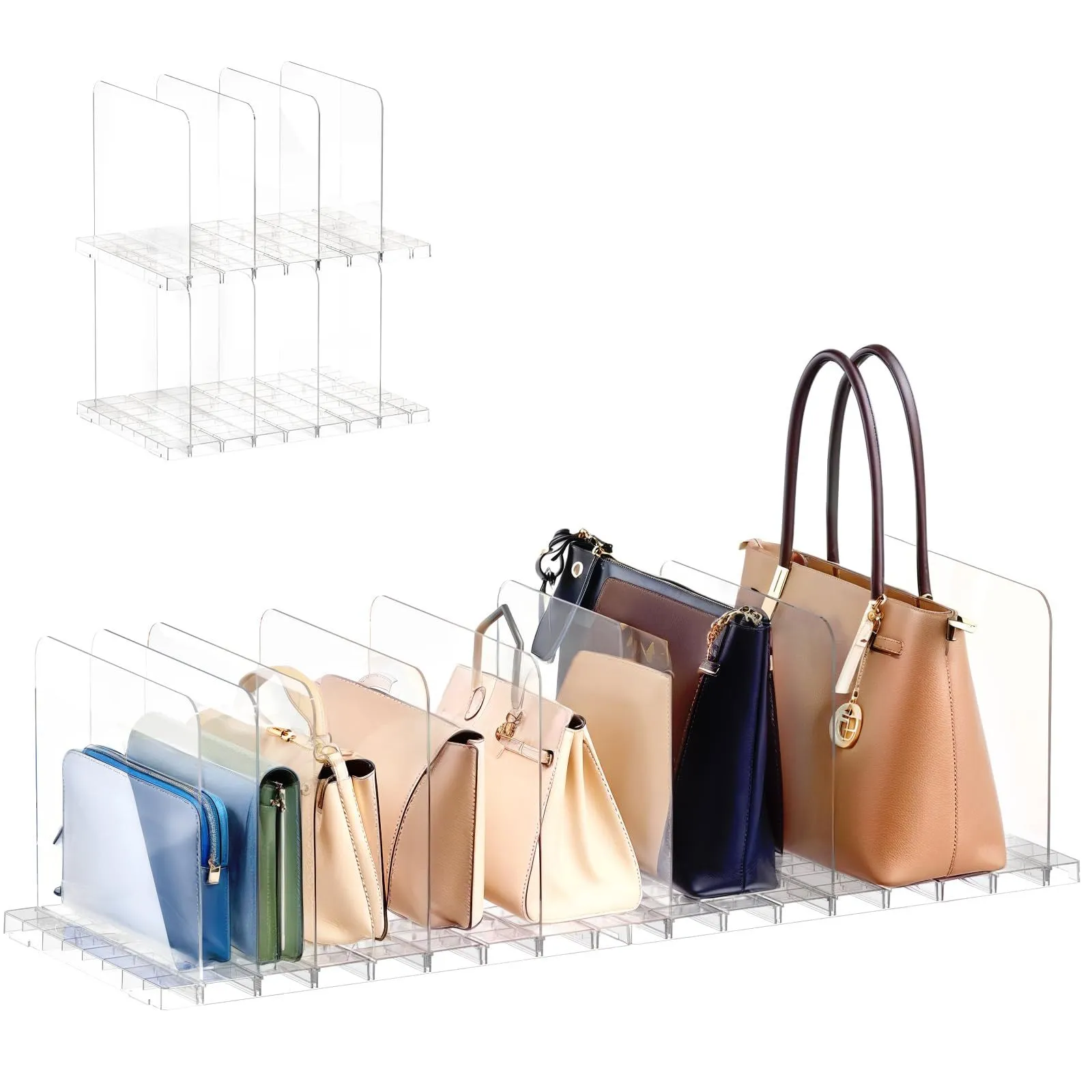 バッグ収納スタンド 2個セット 間隔調節可能 4仕切り 台座連結・積み重ね可能 簡単組み立て 透明 クローゼット カバン収納 約幅36x奥行24x高さ21cm クリア