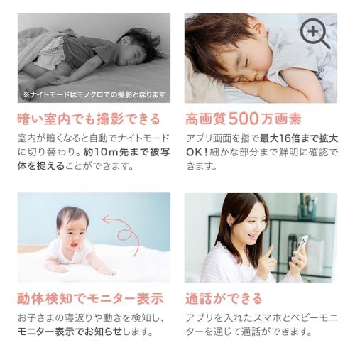 【離れていても声が届く双方向通話】 マイクとスピーカー内蔵で、別室や外出先からスマホ越しに声をかけられます。赤ちゃんが目を覚まして不安そうな時も、すぐにママ・パパの声を聞かせて安心させることが可能。忙しい合間でも家族の絆を感じられる機能です。