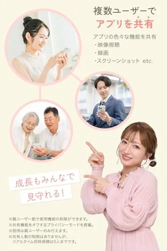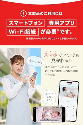 【外出先からもスマホでチェック】 専用アプリを使えば、仕事先や買い物中でもリアルタイム映像を確認できます。Wi-Fi連携により、場所を選ばずいつでもどこでも見守りが可能。共有人数に制限がないため、離れて暮らす祖父母とも可愛い姿をシェアして楽しめます。