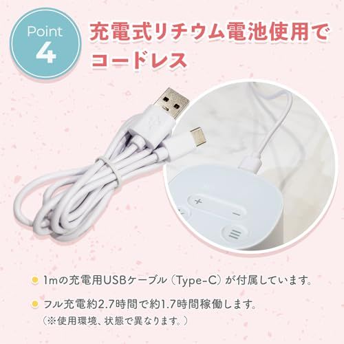 大画面LEDで見やすい操作表示です。一時停止ボタン付きで安全に使用できます。 付属のUSBケーブルで充電が可能です。※電源アダプターは別売りとなります。