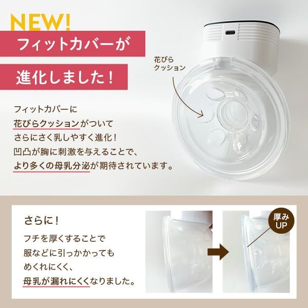【NEW!フィットカバー】花びらクッションがついて、さらにさく乳しやすく進化しました!凹凸が胸に刺激を与えることで、より多くの母乳の分泌が期待されています。フチも厚くなり、漏れにくくなりました。