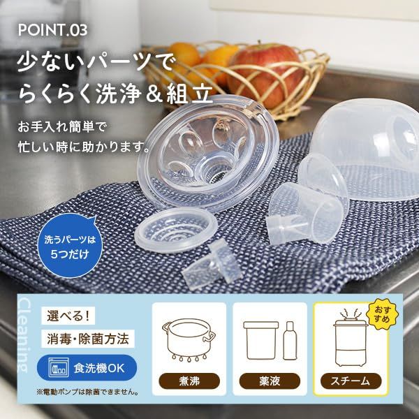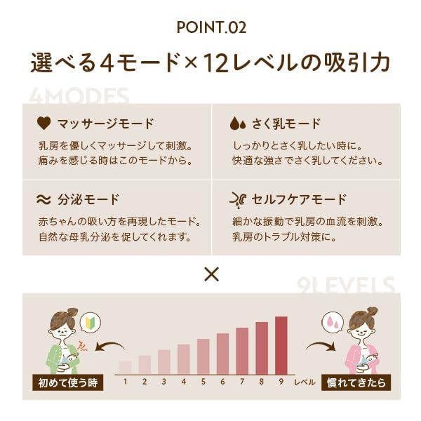 【食品衛生法に基づく試験に適合】厚生労働省令で定める基準に適合する方法で実施した検査で、適合したさく乳器です。もちろん、BPAフリーです。 マッサージモード、さく乳モード、分泌モード、セルフケアモードの4段階のモード、更に12段階のレベル調整も可能 全てのパーツが取り外せるため、簡単に洗浄・消毒が出来ます。組み立ても簡単仕様 USBケーブルで充電、目安は約2.5時間程度で充電完了 ※電源アダプターは付属していません。 1回の充電で30分のさく乳が約45回行え、電源を入れると30分後には自動電源OFFになるので省エネ