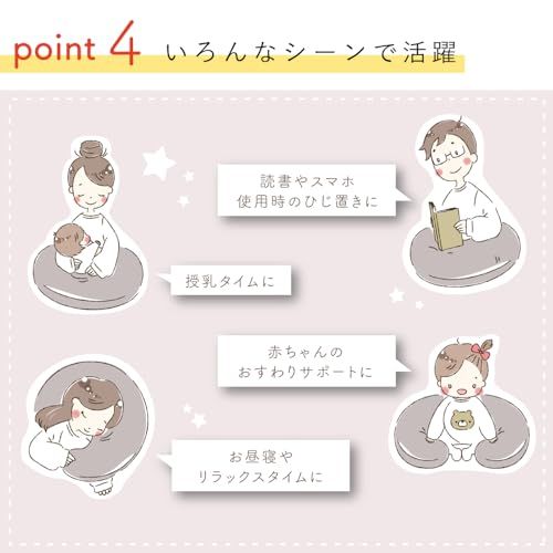 【使用シーン】授乳時だけでなく赤ちゃんのおすわりをサポートしたり、スマホや読書などの補助にもお使いいただけます。