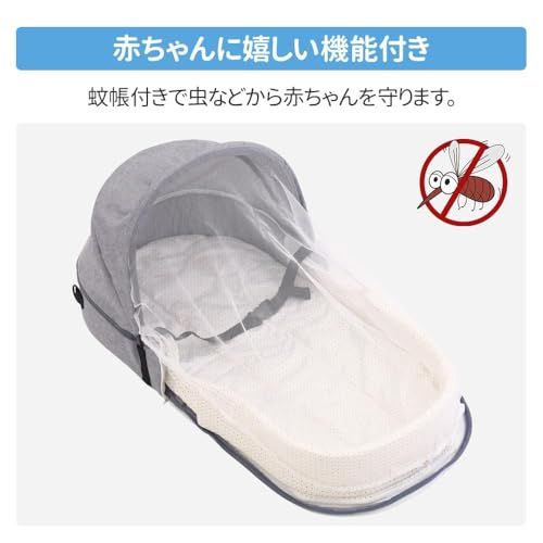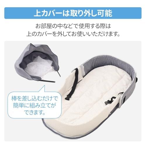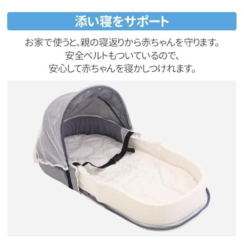 外出時はもちろん、お家での使用も親の寝返りから赤ちゃんを守ります。ベルト付きで添い寝を安全にサポート。蚊帳付きだから、虫から赤ちゃんを守ります。