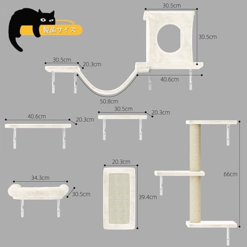 【豪華な猫用家具6点セット】パッケージには猫用スクラッチボード39*20cm(長さ*幅)*1、 キャットツリー66cm(高さ)*1、 キャットステップ*2(長さ*幅:40*20cm*130*20cm*1)、猫の巣34*30cm(長さ*幅)*1、猫ハウス40*30*30cm(長さ*幅*高さ)*1吊り橋50cm長さ(ベッド)*1が含まれいます。当社の壁に取り付けられた猫用シェルフセットには、猫の本能を刺激し、登って(爪を研ぐ)遊びたいという猫の自然な欲求を満たす楽しい環境を提供するために設計された複数のレベルを提供するユニークな遊び構造を備えています。