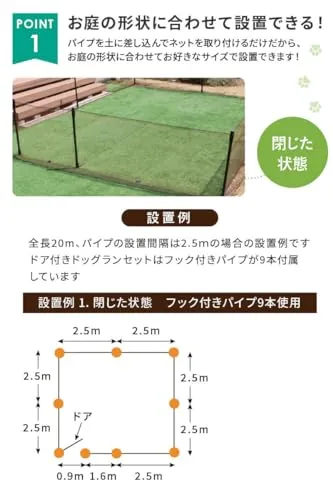 【ダイムファクトリーオリジナル商品】 商品説明:ドア付きで出入りらくらく!ドアと本体がセットになったドッグランセットです!景観になじむブラウン色を採用!自然な色で、お庭になじみます! 商品説明:パイプを地面に刺して、ネットを張るだけ!ドッグランセットをお庭に簡単に設置できます!パイプの設置の仕方で、サイズや形状を調整できるのでお庭にぴったりのドッグランを作ることができます! サイズ(約)本体:高さ90cm長さ20m ※土中30cm埋め込み時 ドッグラン 柵 ペットサークル ドッグサークル 庭 犬 フェンス ネット サークル diy 自作 ペット 家庭ペットゲージ ペットケージ 動物 用