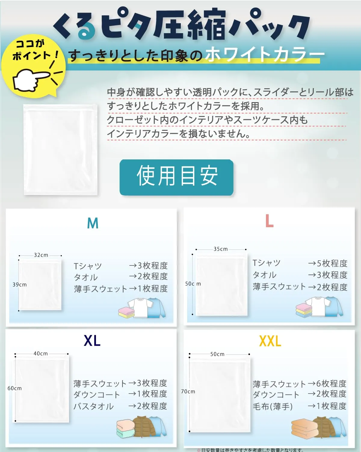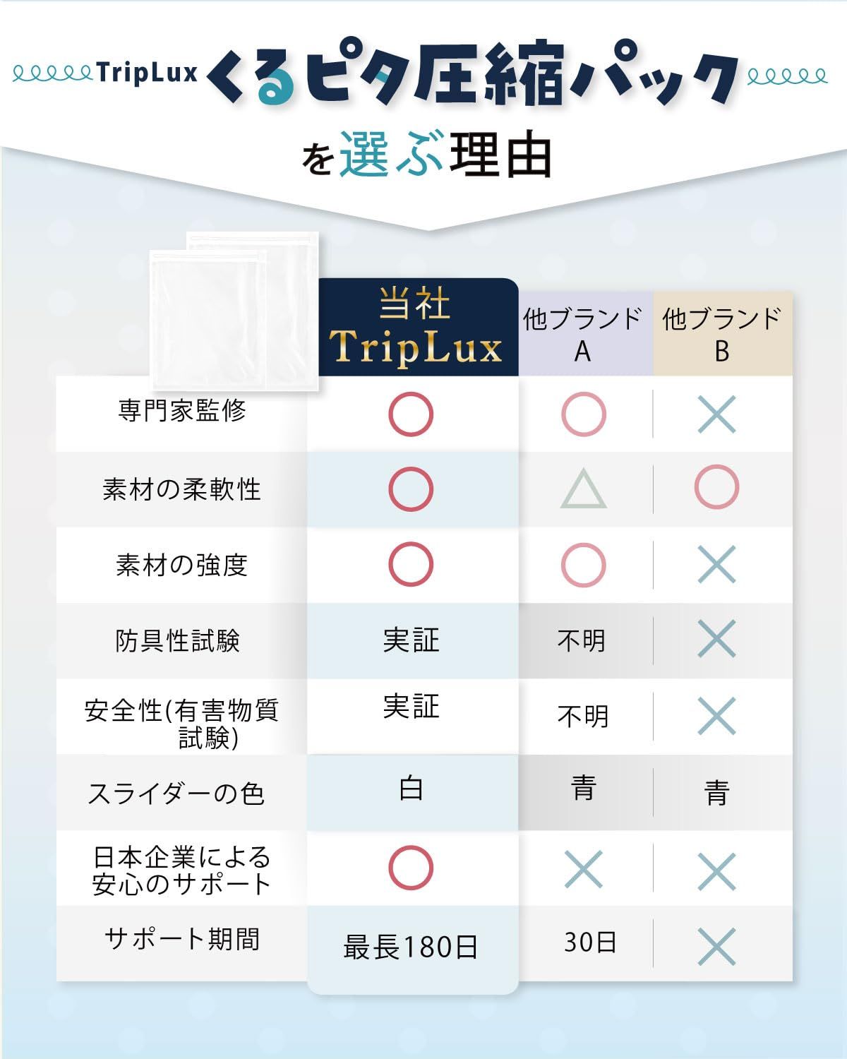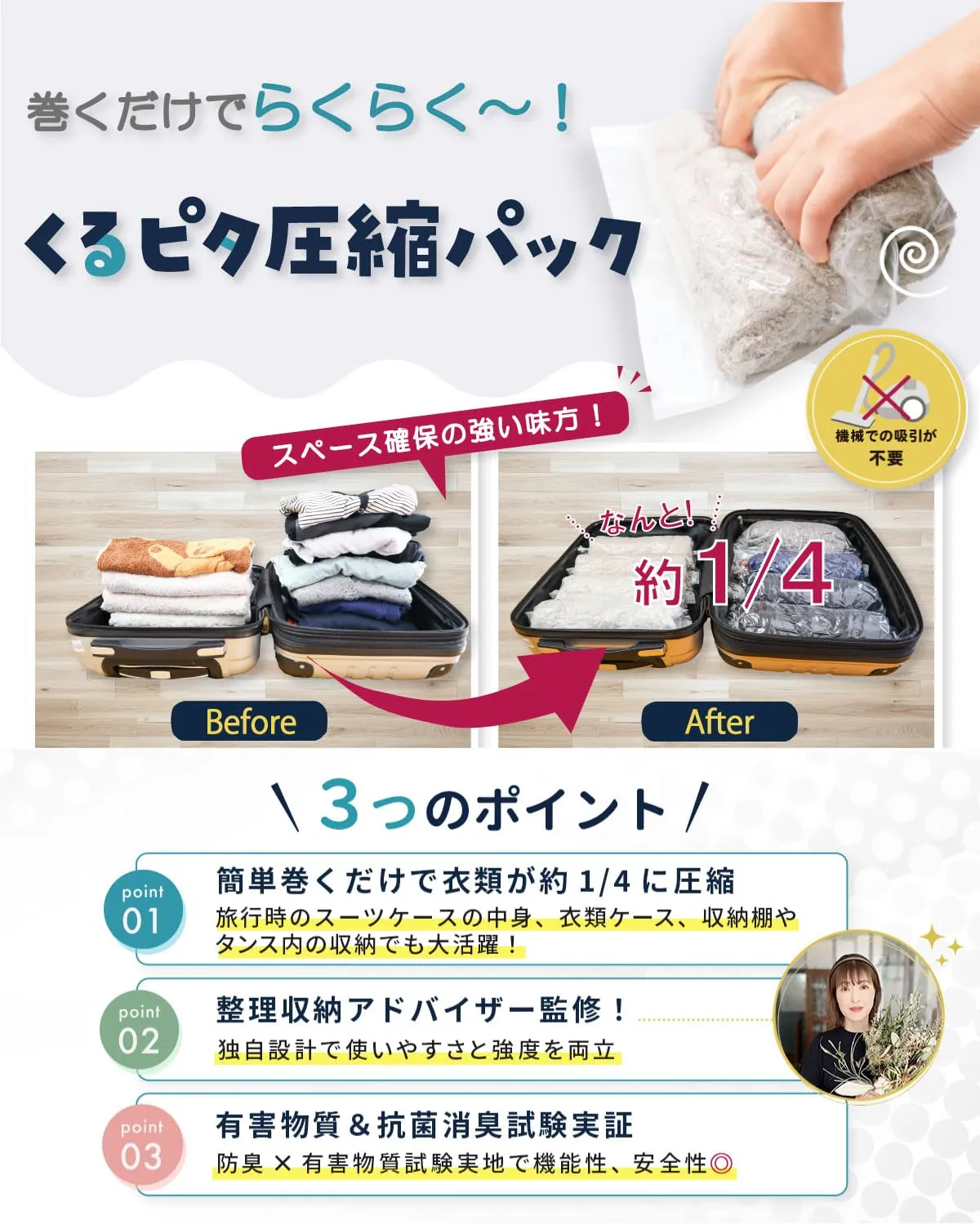 【旅行にも自宅収納にも◎】TripLuxくるピタ圧縮パック(掃除機不要) 圧縮袋 出張 手巻 トラベルグッズ (M5枚+L5枚) 簡単まくだけで衣類が約1/4に圧縮! 旅行時のスーツケースの中身、衣類ケース、収納棚やタンス内の収納で大活躍! 整理収納アドバイザー監修! 独自設計で使いやすさと強度を両立 有害物質&抗菌消臭試験実証! 防臭x有害物質試験実地で機能性・安全性◎ すっきりとしたホワイトカラー採用でインテリアカラーを損ないません。 掃除機や専用吸引機不要で簡単手巻きで高圧縮! 最後までご確認頂き誠にありがとうございました。 ご確認頂き、ご購入いただけましたら幸いです。 何かご不明点などがございましたらお気軽にメッセージからお問い合わせ下さい。