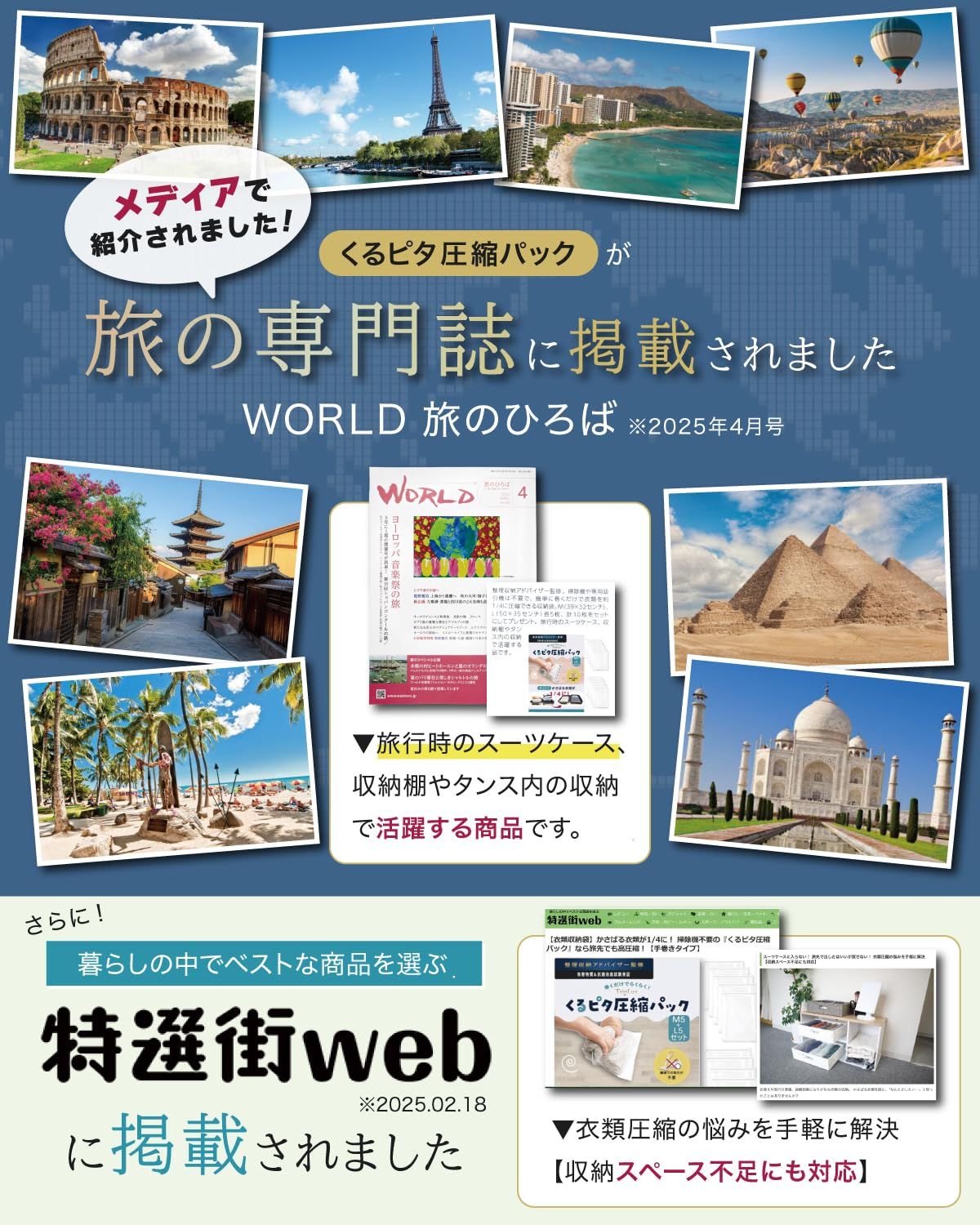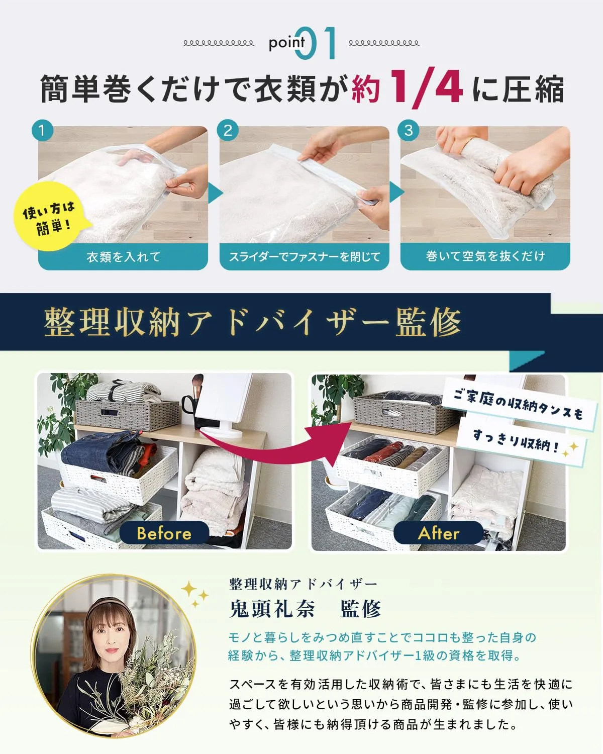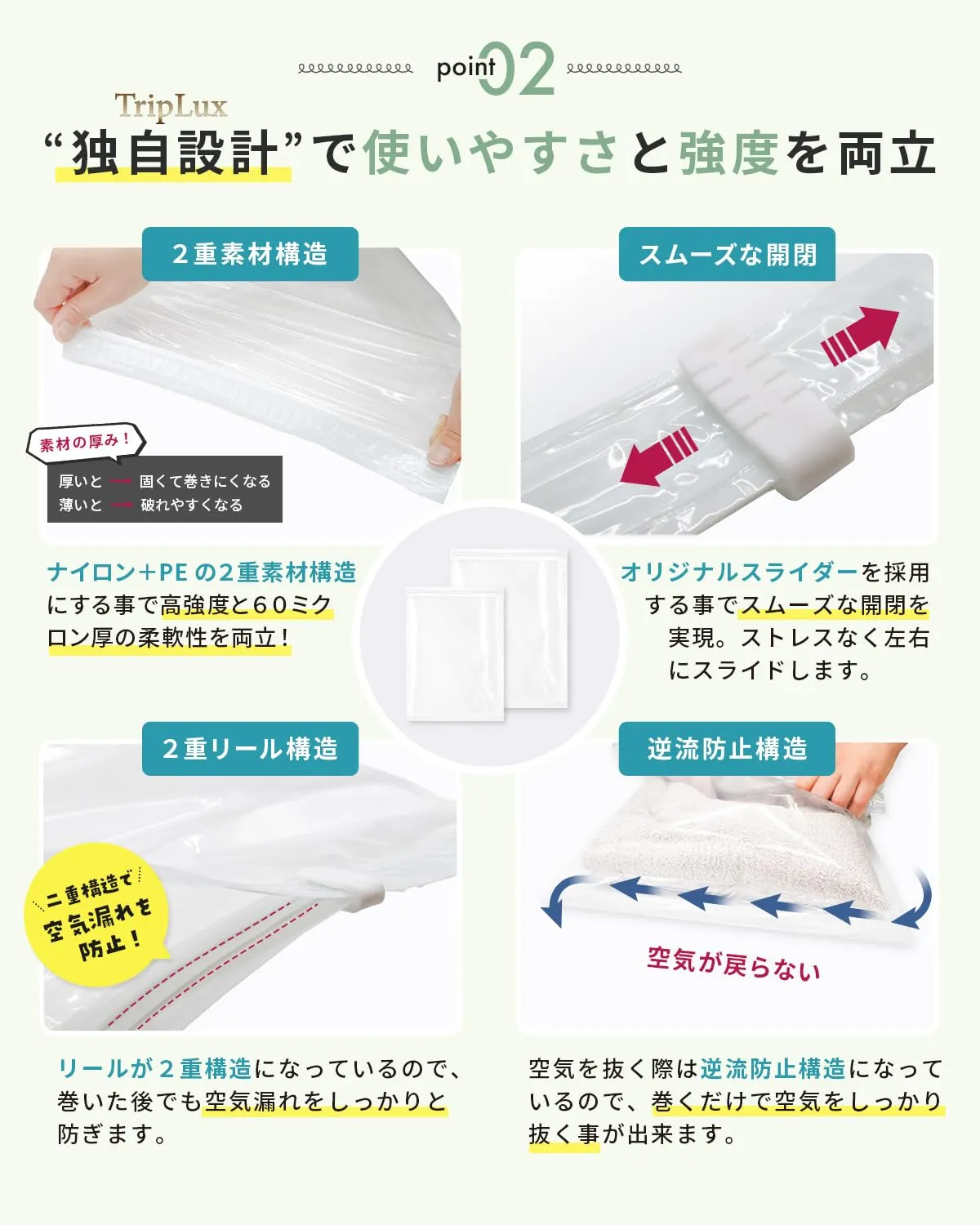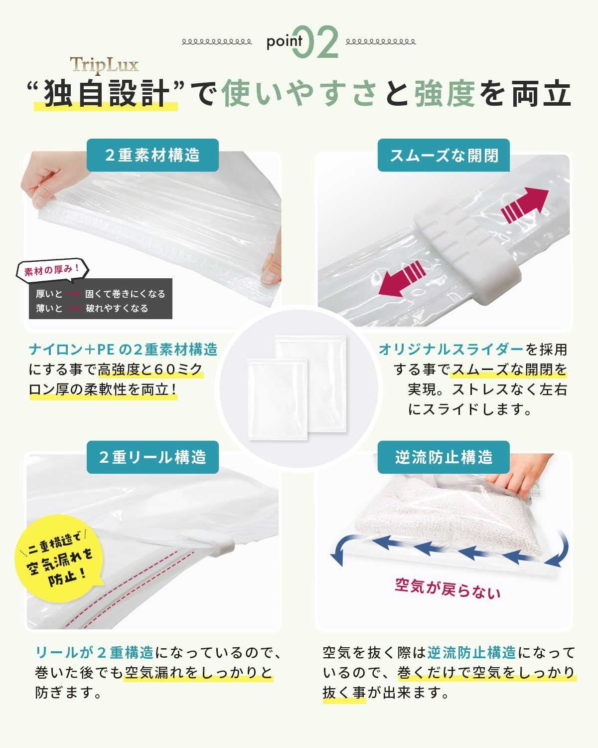 【旅行にも自宅収納にも◎】TripLuxくるピタ圧縮パック(掃除機不要) 圧縮袋 出張 手巻 トラベルグッズ (M5枚+L5枚) 簡単まくだけで衣類が約1/4に圧縮! 旅行時のスーツケースの中身、衣類ケース、収納棚やタンス内の収納で大活躍! 整理収納アドバイザー監修! 独自設計で使いやすさと強度を両立 有害物質&抗菌消臭試験実証! 防臭x有害物質試験実地で機能性・安全性◎ すっきりとしたホワイトカラー採用でインテリアカラーを損ないません。 掃除機や専用吸引機不要で簡単手巻きで高圧縮! 最後までご確認頂き誠にありがとうございました。 ご確認頂き、ご購入いただけましたら幸いです。 何かご不明点などがございましたらお気軽にメッセージからお問い合わせ下さい。