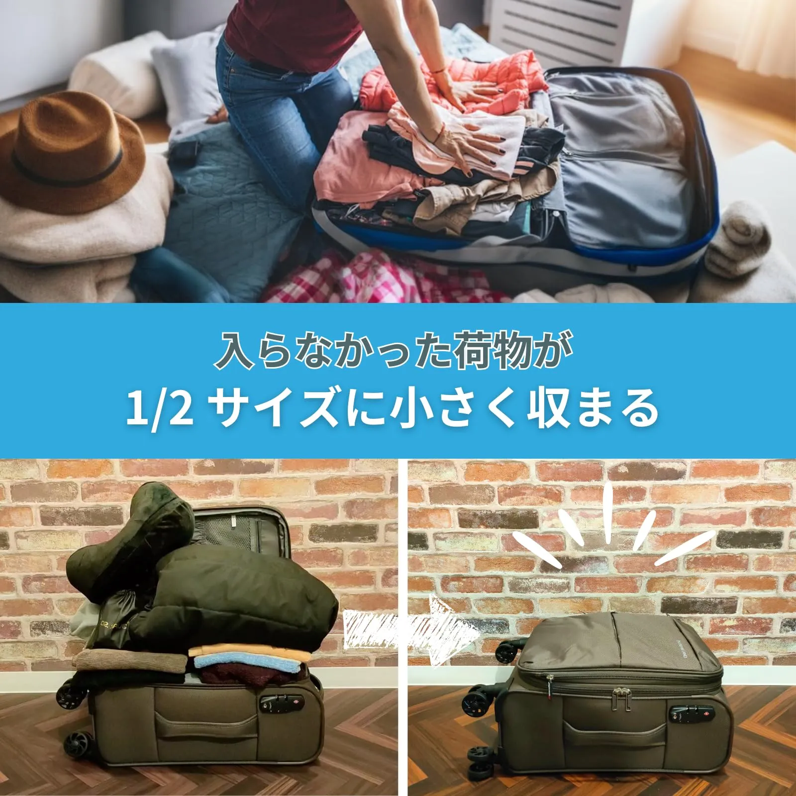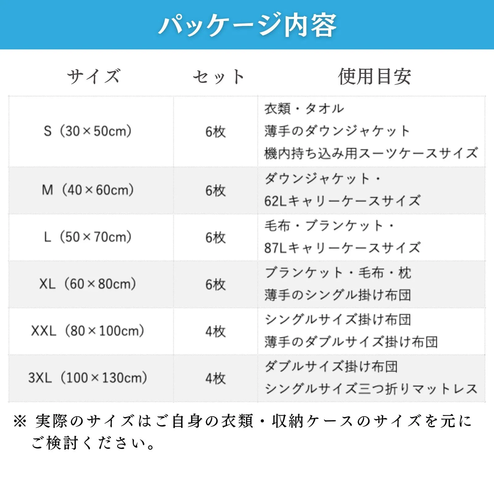 【利便性の高い5サイズ展開】飛行機手荷物サイズに便利なS(30×50cmサイズ)をはじめ、シングルかけ布団が入るXXLサイズまでをご用意。 最後までご確認頂き誠にありがとうございました。 ご確認頂き、ご購入いただけましたら幸いです。 何かご不明点などがございましたらお気軽にメッセージからお問い合わせ下さい。