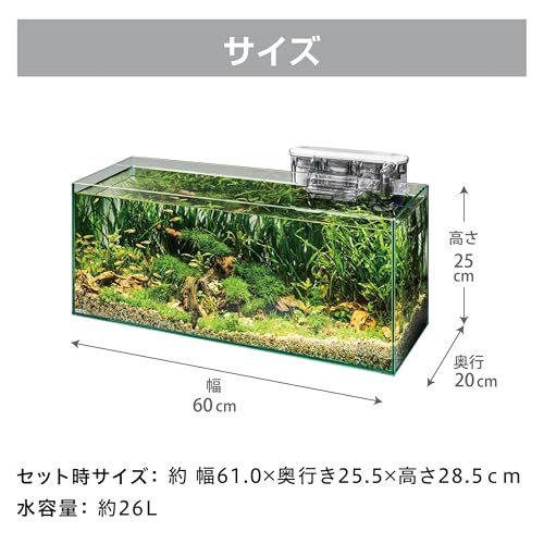 【製品仕様】水槽サイズ:約幅60奥行20高さ25cm、ガラス厚:5mm、セット時サイズ:約幅61奥行25.5高さ28.5cm、水容量:約26L セット内容:ガラス水槽、外掛け式フィルター、ガラスフタ(ホルダー付)、クッションマット 本製品にはフィルター用USBアダプターは付属していません。当社純正品(GEX「USBアダプターG-1A」)もしくは市販のUSBアダプターをお買い求めください。
