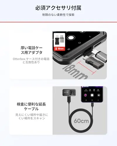 【携帯性と使いやすさ】重さわずか20g(単三電池1本分の軽さ)の超軽量設計。ほとんどのスマートフォンやタブレット(Android/iOS)に接続するだけで、プラグアンドプレイで使用できます。画面を90回転(自動・手動切り替え可能)できるため、狭い場所や高い場所の測定も、スマートフォンの向きに合わせて快適に検査できます。パッケージには、60cm延長ケーブル、収納バッグ、USB-CおよびLightning接続ケーブルが付属。iPhoneとAndroidの両方に対応し、届いたその日からすぐに使い始められます。