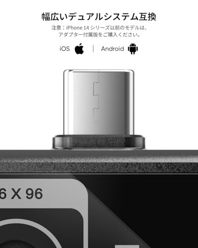 【携帯性と使いやすさ】重さわずか20g(単三電池1本分の軽さ)の超軽量設計。ほとんどのスマートフォンやタブレット(Android/iOS)に接続するだけで、プラグアンドプレイで使用できます。画面を90回転(自動・手動切り替え可能)できるため、狭い場所や高い場所の測定も、スマートフォンの向きに合わせて快適に検査できます。