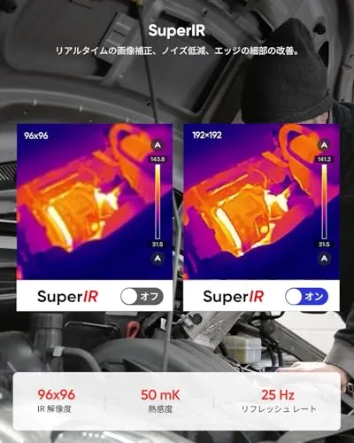 【熱パターンの可視化、わかりやすい画像】 MiniEは9,216ポイント(9696)で温度を測定し、熱パターンを色で可視化します。推測に頼らず、目で見てすぐに問題箇所を判断できます。SuperIR画像強化技術により、9696の赤外線解像度を192192のスーパー解像度に向上し、25Hzでなめらかなリアルタイム表示を実現。検査現場での判断がスピーディーになります。