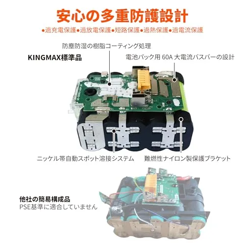 【5大安全保護機能で安心使用】 過充電保護:充電しすぎても自動停止! 過放電保護:バッテリーの消耗を防ぎ長寿命化! 短路保護:ショート時の危険を回避! 過熱保護:高温時も自動制御で安全持続! 過電流保護:異常電流をブロック!異常時には即時遮断する高度な保護回路で、工具とユーザーの安全を二重に守ります。プロ現場の過酷な使用環境でも安心してお使いいただけます。KBP1840最大放電電流60A。