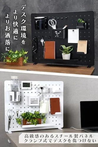 デスク環境をより快適によりお洒落に!デスクに挟み込むだけで取付可能なクランプ式ペグボード。デスク上に散乱している物をペグボードに載せてデスク広々、生産性向上、お洒落で快適なデスク環境になります!