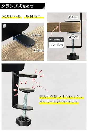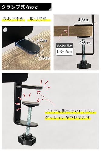 【配線整理としても】ペグボードをデスク下に取り付け、付属フックや付属トレーを活用することによりケーブルオーガナイザーとしても使用いただけます。 デスクを傷つけない設計:クランプ式の為、デスクに穴をあける必要はありません。デスクに挟み込めばOKです。またデスクを傷つけないように、デスクを挟む箇所にはクッションがついてます。 商品内容:・ペグボード1・マグネット5・フック3・トレー大1・ラバー付きトレー2・ペン立て1・ドリンクホルダー1 対応デスクの厚み:1.36