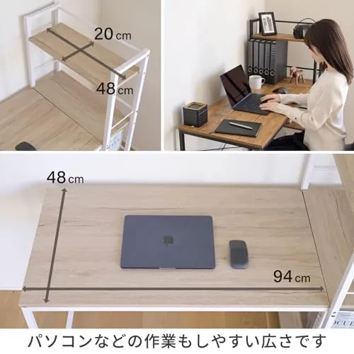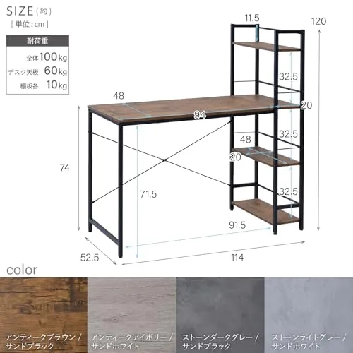 【省スペースで設置できる】ラックとデスクが一体になっているのでしっかりと収納力を確保しながら、ワンルームや寝室などの狭いお部屋にも設置しやすくお部屋を広く使えます。 本体サイズ:幅114奥行52.5高さ120cm甲板の高さ : 74cmラック棚板サイズ:幅20奥行48cm天板サイズ:幅114奥行48cm耐荷重 : 全体100kg(天板 : 60kg、棚板各10kg)構造部材 : フレーム/金属(スチール)、棚板/合成樹脂化粧パーティクルボード(メラミン樹脂)甲板の表面材 : 合成樹脂化粧パーティクルボード(メラミン樹脂)表面加工 : フレーム/エポキシ樹脂塗装