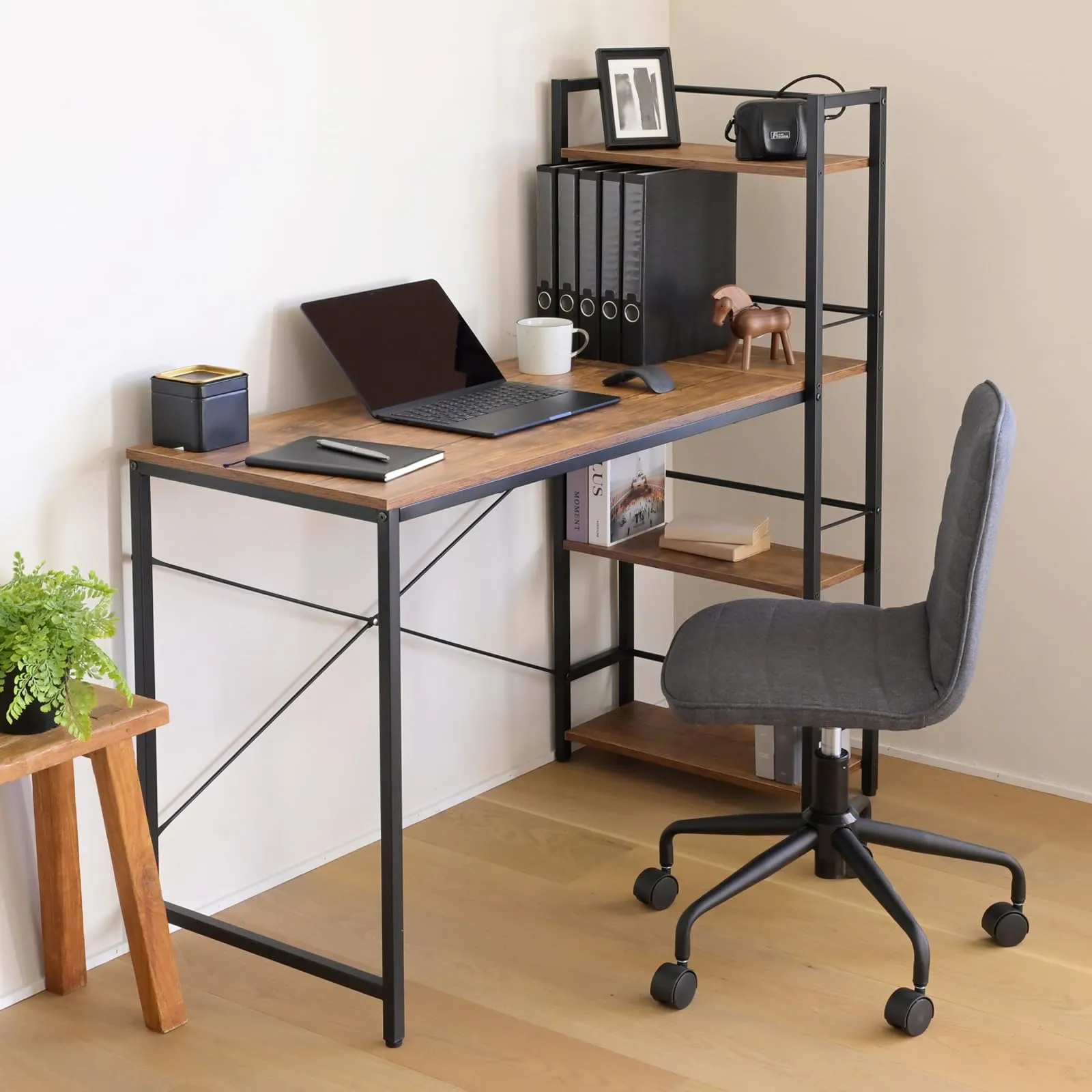 【ラック一体型デスク】本やファイルボックスなどの収納に便利な棚が付いたデスクです。ラックとデスク一体型なので、作業中に必要なものがパッと手に取れて作業がはかどり、学習机や在宅ワークにもぴったりです。ラックはA4ファイル対応です。