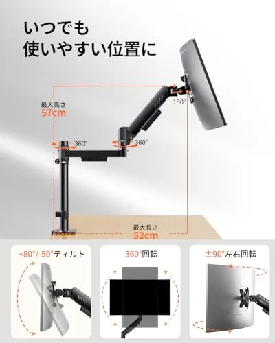 【思い通りに画面位置調整可能】ErGearモニターアームはチルト調整は80度から?50度まで調節できます。日光や照明の映り込みを軽減し、見やすい角度をキープします。さらに180度のスイベルと360度の回転機能により、縦表示・横表示もストレスなく切替可能。プログラミング、書類作成、チームでの画面共有まで、あなたの作業を快適に支えます。