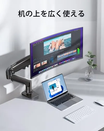 【デスク上のスペースをスッキリ】モニターアームを使うことでスタンド部分が無くなり、ディスプレイを浮かせて設置できるため、ディスプレイの下のスペースが生まれて机の上を広々と使うことができるようになります。アームはケーブル通しを搭載して配線を隠すことで見た目がすっきりします。